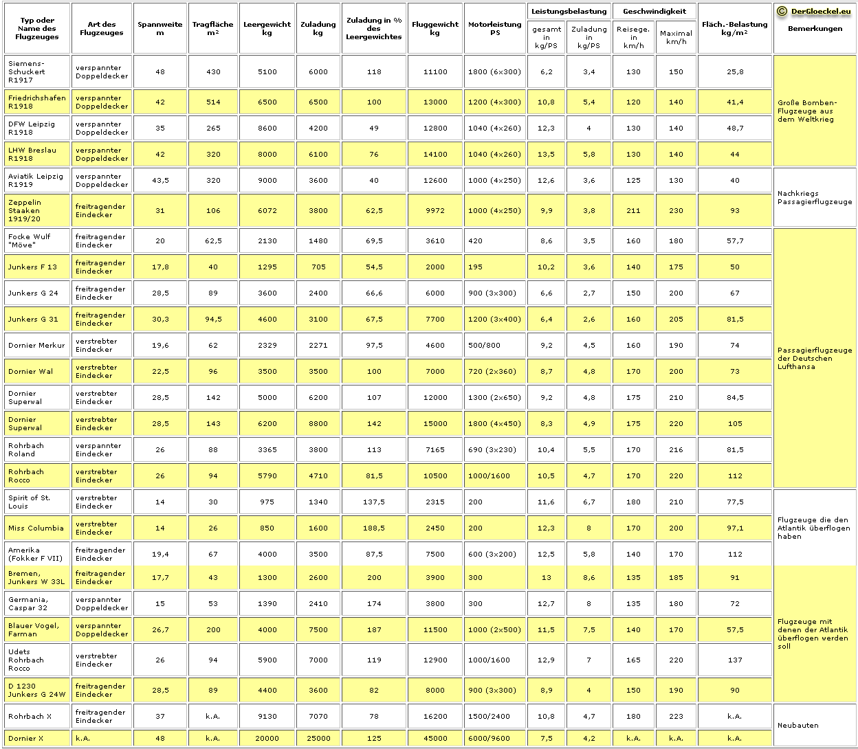 Typ oder Name des Flugzeuges; Die Art des Flugzeuges; Die Spannweite in Meterangabe; Die Fläche der Tragfläche in Quadratmetern; Das Leergewicht in Kilogramm; Die Zuladungsmöglichkeit in Kilogramm; Die maximale Zuladungsmöglichkeit in Prozent des Leergewichtes; Das Fluggewicht in Kilogramm; Die Motorleistung in PS; Die Leistungsbelastung einmal in Form der Gesamtbelasung in Kilogramm pro PS und der Zuladung in Kilogramm pro PS; Die Geschwindigkeit in Form der Reisegeschwindigkeit und der Maximalgeschwindigkeit jeweils in Kilometer pro Stunde; Die Flächenbelastung in Kilogramm pro Quadratmeter und etwaige Bemerkungen.